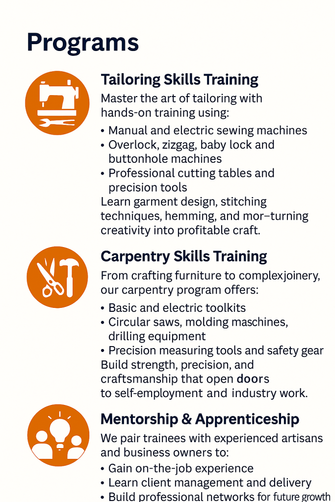 Trainees master in-demand trades — tailoring and carpentry — using real tools, modern machines, and materials that prepare them for the market. By the end of training, they can produce quality garments or furniture that meets local and regional demand.